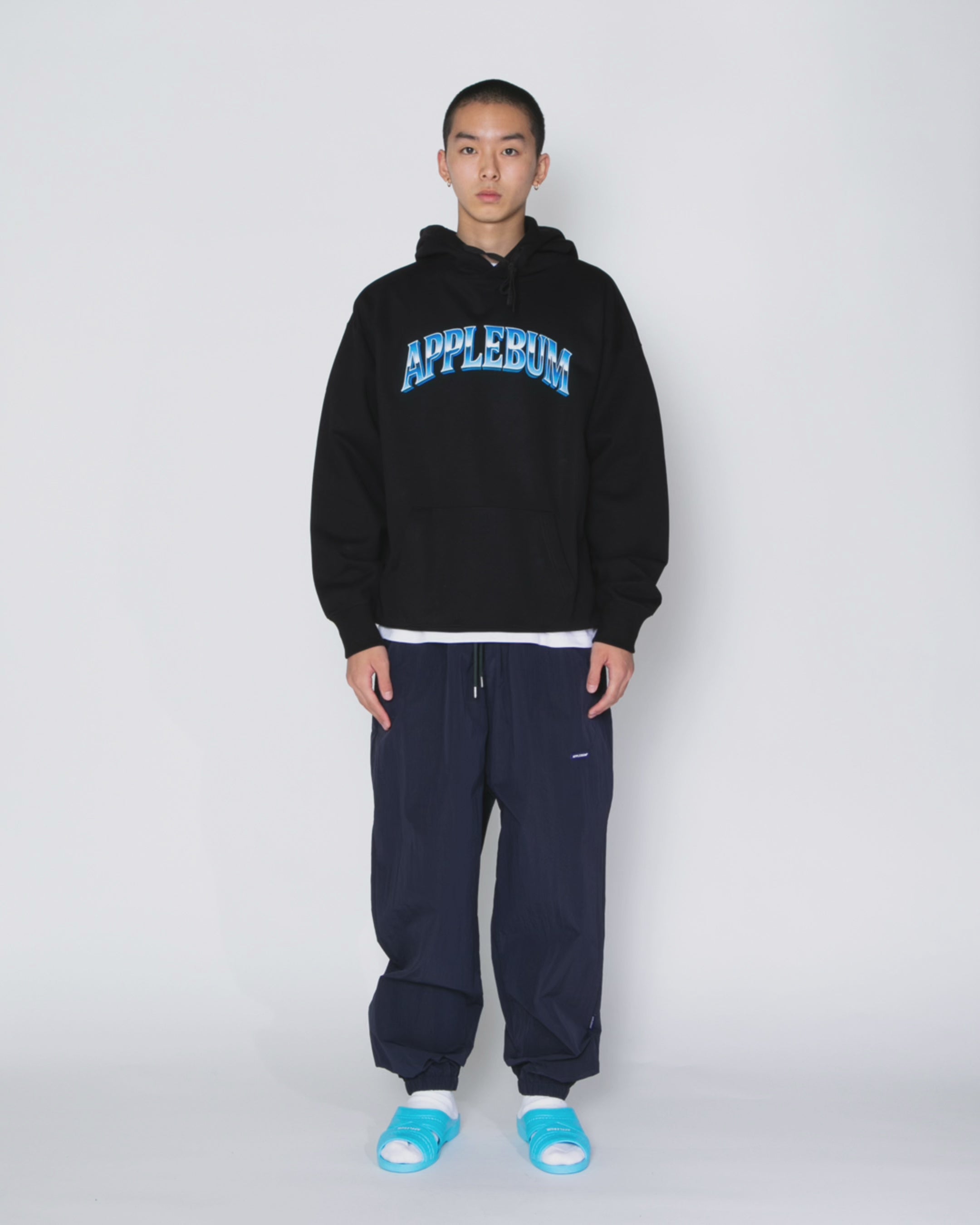 80年代ハリウッドSF映画に着想を得た、アーチ型のAPPLEBUMロゴパーカー。 当時のポスターを思わせるメタリックなブルーグラデーションが、胸元で存在感を放ちます。 懐かしさと新しさが交差する、レトロフューチャーな空気をまとった一枚。 あえて裾からインナーのTシャツを覗かせたスタイリングもおすすめです。