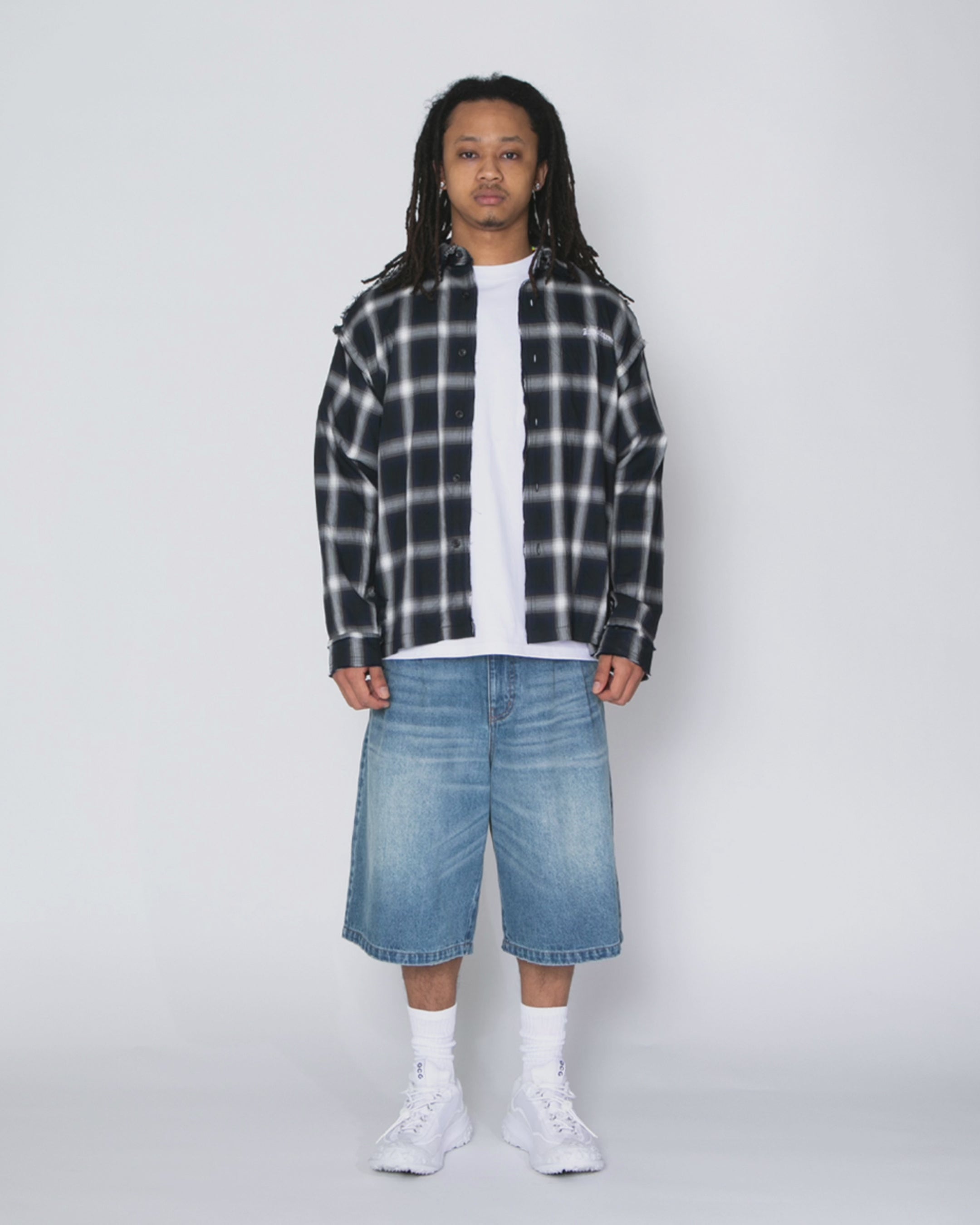 しなやかなコットン素材を使用したオンブレチェックシャツ。 落ち着いたトーンのチェックに、肩や袖の切り替えのほつれ感がさりげないアクセントとなり、 日常に取り入れやすいバランスに仕上げました。 程よくゆとりを持たせたシルエットが、大人のリラックス感とストリートのムードを共存させる1枚。 胸元の小さなロゴ刺繍が控えめに主張し、レイヤードから単体使いまで幅広いスタイリングにフィットします。
