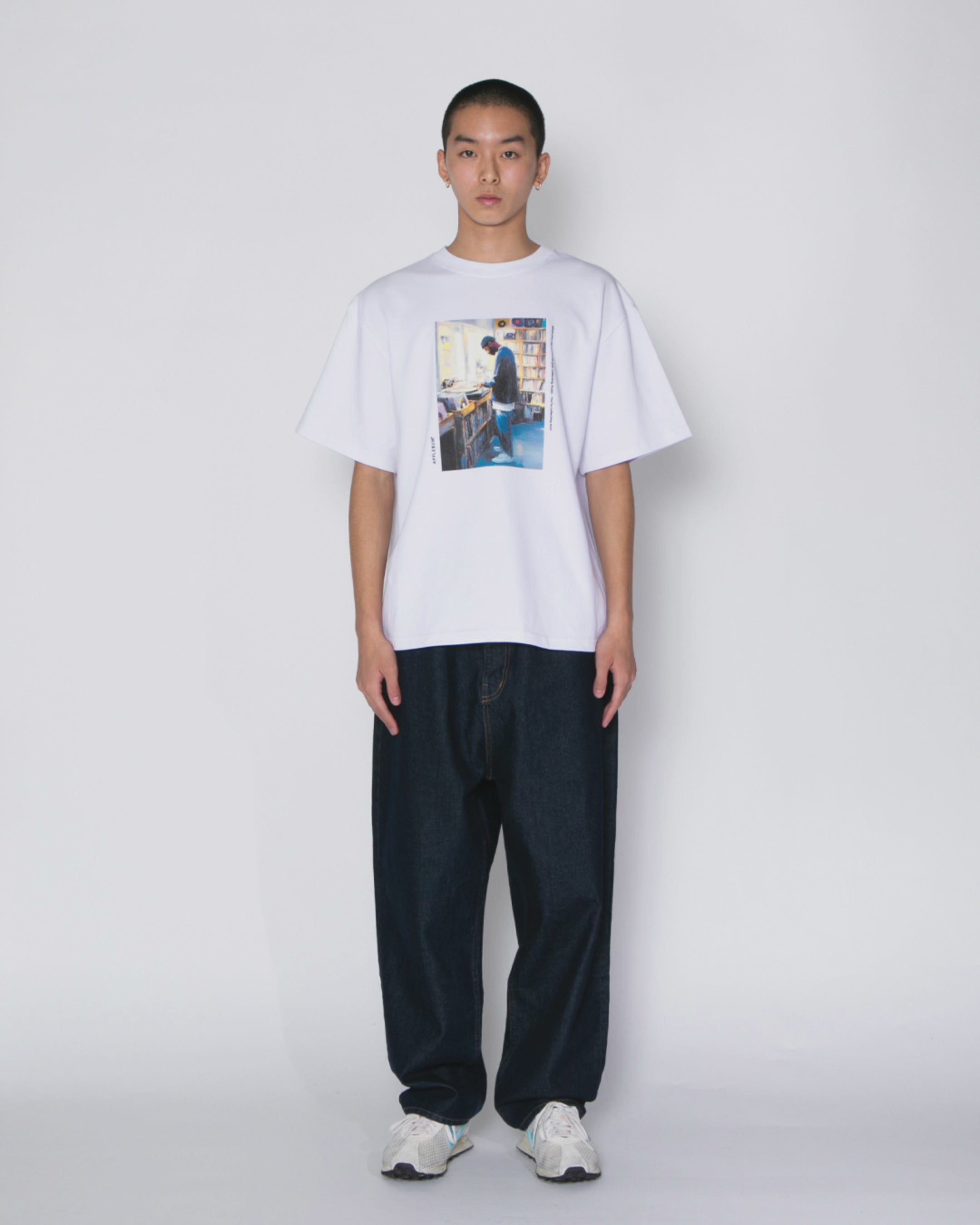 レコードショップでディグに没頭する姿を、油絵のようなタッチで描いたグラフィックTシャツ。「When you dig, you're not just collecting music. You're collecting soul.」 (ディグするとき、君が集めているのは音楽じゃない。魂だ。)のメッセージが、このデザインの核心を示しています。 レコードを掘り起こす行為を、単なる収集ではなく“魂を探すこと”として捉えた一枚。 静かな筆致とヴィンテージライクな質感の中に、APPLEBUMの哲学とヒップホップへの敬意が凝縮されています。 滑らかな肌触りの生地感、シルエットをこだわり抜いたオリジナリティ溢れる1枚です。