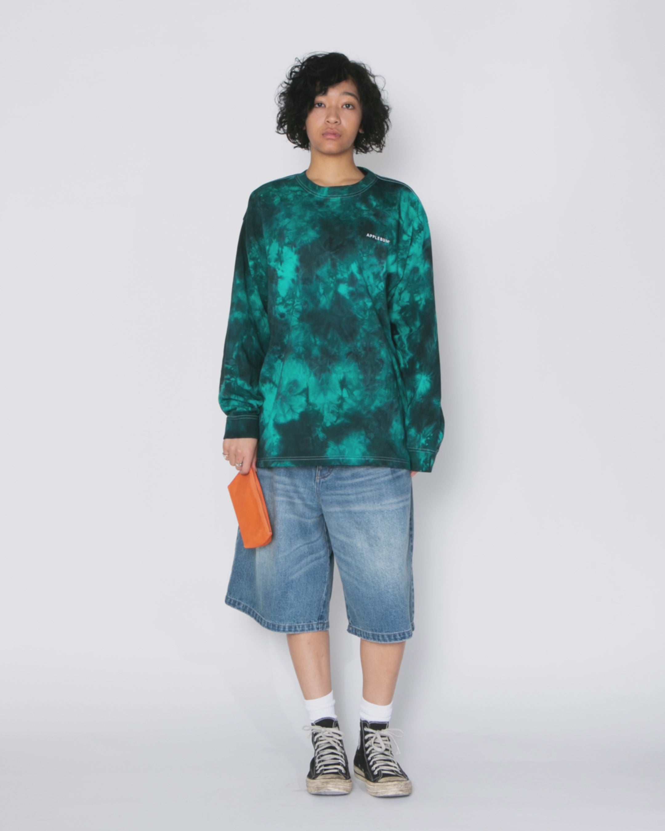 綿100%、12ozのオリジナル極厚ボディを、クリエイティブな染め屋「TiEDYE FREAK」による手染めで仕上げたロングスリーブTシャツ。一点ずつ異なるグルーヴ感ある濃淡が、まるでサウンドの波のように表情を変える。胸にはAPPLEBUMロゴを控えめに配置。 クラシックなロゴワークと、染めのユニークネスが共鳴する存在感抜群の一枚。※製品の特性上、サイズに個体差がある場合がございます。 ※製品の特性上、色味に個体差がございます。※製品染加工を施している為、色落ちの可能性がございます。