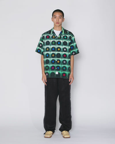 壁一面のレコード棚をそのまま切り取って落とし込んだ、APPLEBUMらしいカルチャー全開の総柄アロハシャツ。 色とりどりのセンターレーベルが水玉のようにリズミカルに並び、“音と一緒に暮らす部屋の匂い”まで感じさせるようなグラフィックです。 使い込まれた盤面の質感や棚の影まで緻密に再現したプリントは、ミュージックラバーにはたまらないリアルさ。 落ち着きのあるグリーンベースが全体をまとめ、派手になりすぎずスタイルに自然に馴染みます。 ゆったりとしたオーバーサイズシルエットで、夏のラフな着こなしにも余裕のある抜け感をプラス。 一枚で主役になる、カルチャーをそのまま着るためのアロハです。